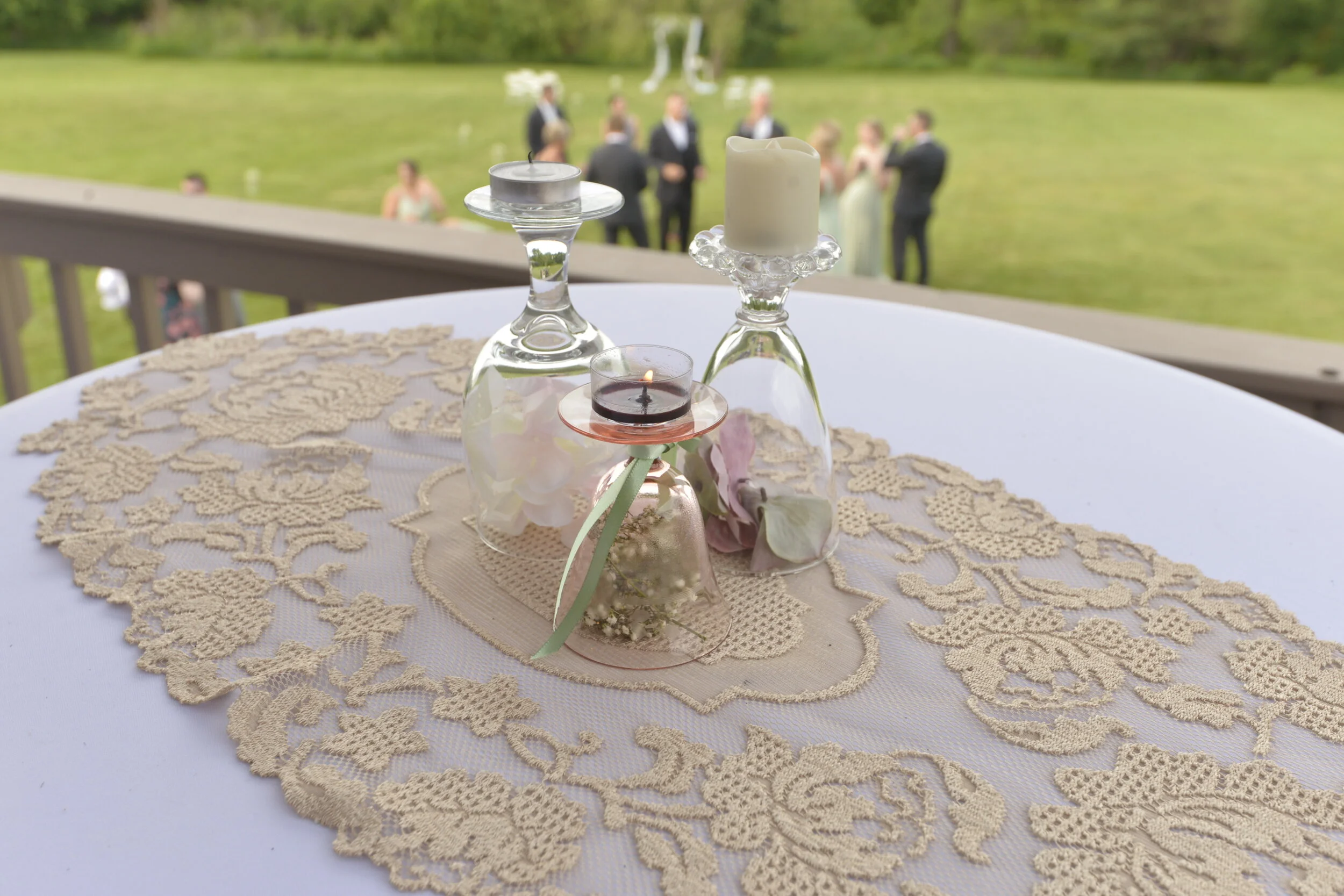 To decorate, they made centerpieces with lace doilies that belonged to Jordan’s “Gigi,” (great-grandma on Rich’s side), along with glassware and candles they already owned. They added “white lights galore” to create a beautiful ambiance.